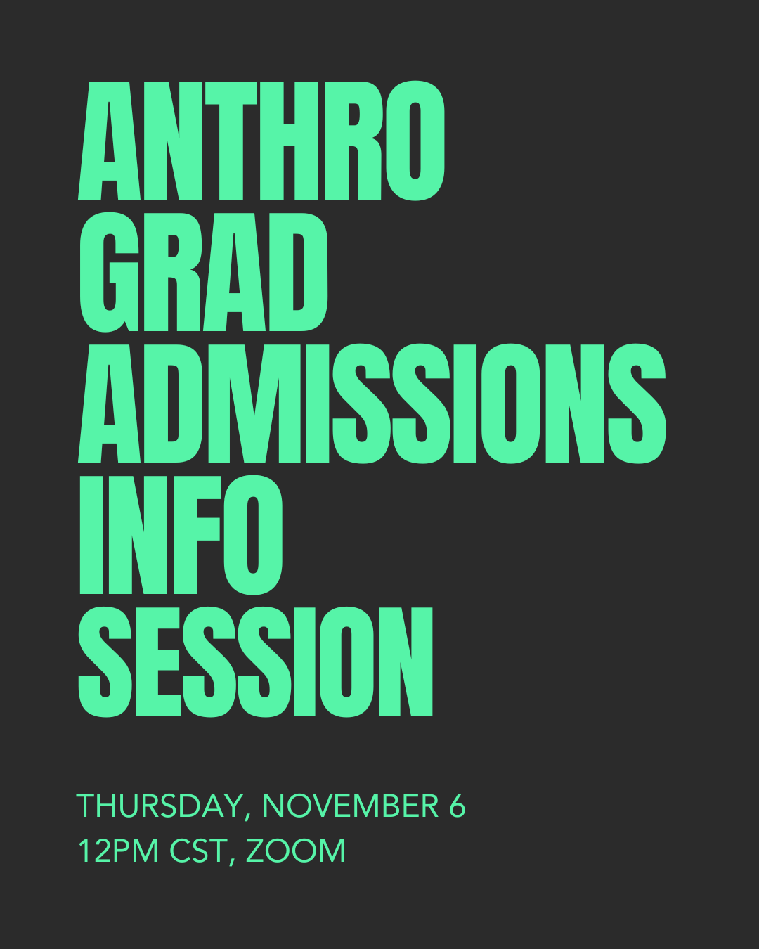 Please join us for a Grad Admission Information Session on Thursday, November 6, from 12-1pm (CST) via Zoom. Prospective students have the opportunity to meet with the Director of Graduate Studies Dr. Ilana Gershon as well as faculty members Dr. Gokce Gunel, Dr. Huatse Gyal, and Dr. Cymene Howe.